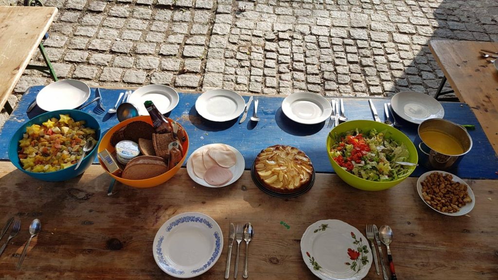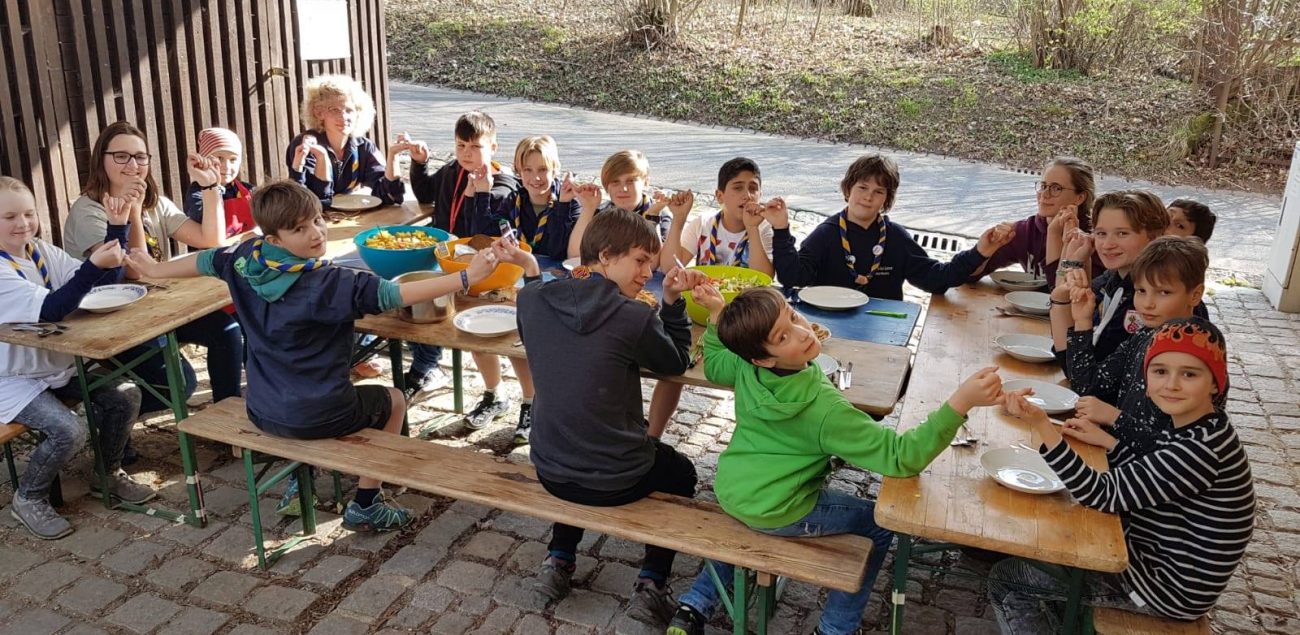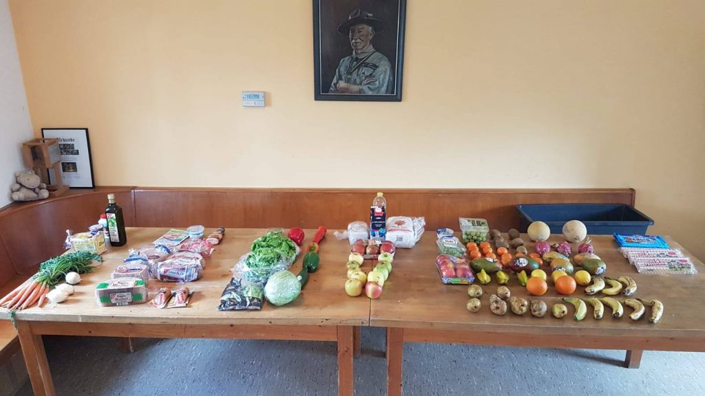 Das Highlight, eine Woche später, war ein Menü, gekocht aus „geretteten“ Lebensmitteln. Ein Supermarkt stellte der Sippe Oktopus Lebensmittel zur Verfügung, die nicht mehr verkauft werden und eigentlich weggeworfen werden müssen. Daraus zauberten die Pfadfinderinnen und Pfadfinder ein leckeres Sechs-Gänge-Menü: Von der Karottencremesuppe mit Croutons als Vorspeise über einen selbstgebackenen Apfelkuchen bis zum süßen Obstsalat ließen es sich die Jugendlichen schmecken. Ob eine Banane nun eine braune Stelle mehr oder weniger hat? Sie schmeckt trotzdem genauso gut!