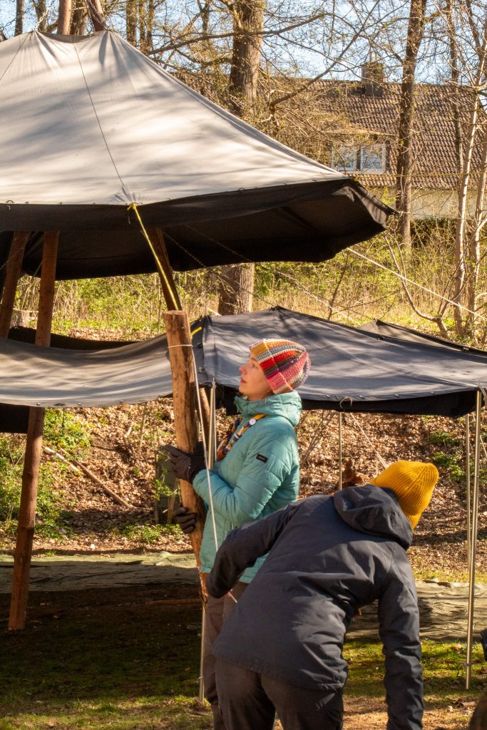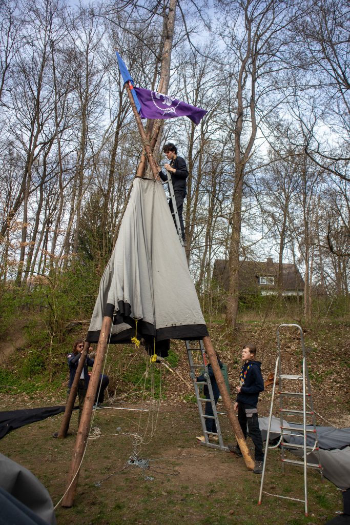 Das Technik Team baute am Samstag ein Mega-Set auf. Ein Mega-Set?! Das ist ein Konstruktion die aus einem Außenring aus 6 Kothen Planen und 6 Zwischenplanen. Das Dach ist ein 12er Jurten Dach. Fun Fact: ein Mega-Set hat den gleichen Durchmesser wie einer 18er Jurte.