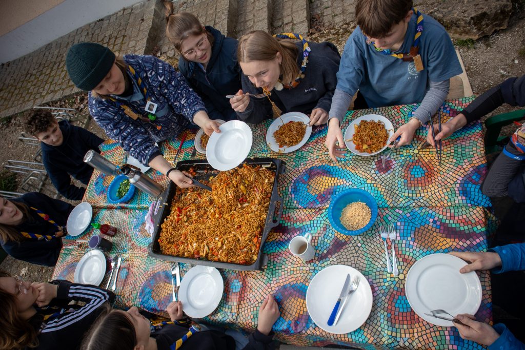 Das Koch Team beschäftigte sich damit, wie man eine große Gruppe auf einem Zeltlager bestmöglich bekochen kann. Es wurde fleißig Rezepte für das Wochenende herausgesucht, kalkuliert, eingekauft und dann leckeres Essen zubereitet. Außerdem durfte jede*r einmal den Gaskocher anschließen. Das Koch Team zauberte für das Wochenende Asia Nudeln, ein Salat Buffet am Samstagabend und ein Pfannkuchen Frühstück am Sonntag.