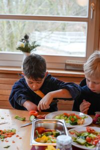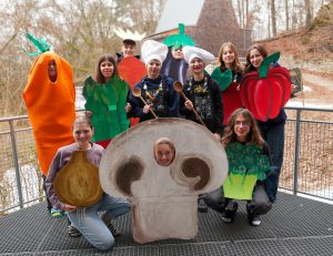 Am Freitag ging es für den ganzen Stamm Graf Gebhard am Bahnhof los, zuerst fuhren wir mit dem Zug, das letzte Stück sind wir zum Knappenberg gewandert. Gleich nach dem Abendessen begrüßten uns die Köche Günni Gourmet und Gustav Gaumen und stellten uns ihr Gemüse vor. Natürlich sind die Tomate, die Zwiebel und die Paprika das beliebteste Gemüse und keiner von ihnen kannte Brokkoli, Stangenspargel und Karotte. Der Champignon schlug vor, dass wir uns alle erst einmal kennenlernen, bevor wir sie als ekelhaft abstempeln.
